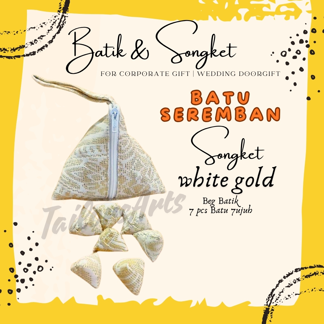 Batu Seremban Songket Handmade (1 Bag+7pcs Batu) – WHITE GOLD SONGKET (BS04)
